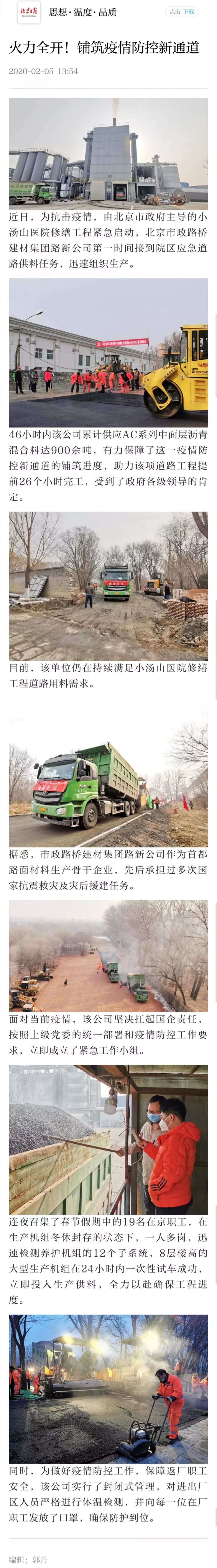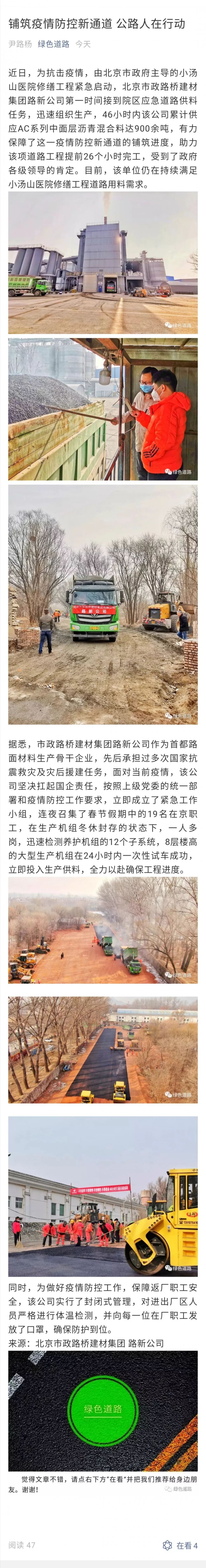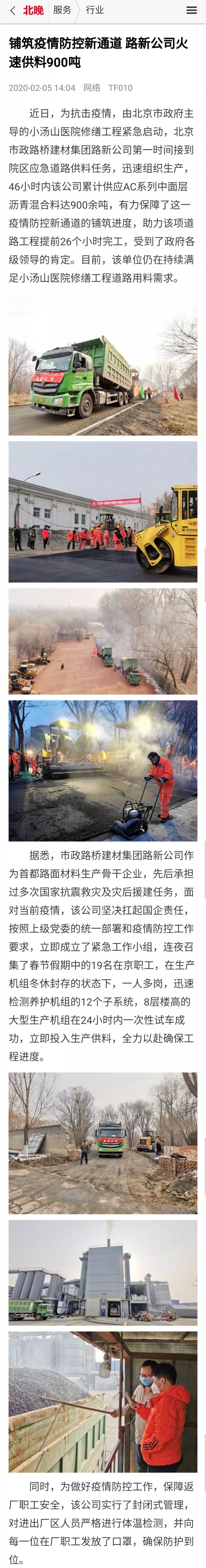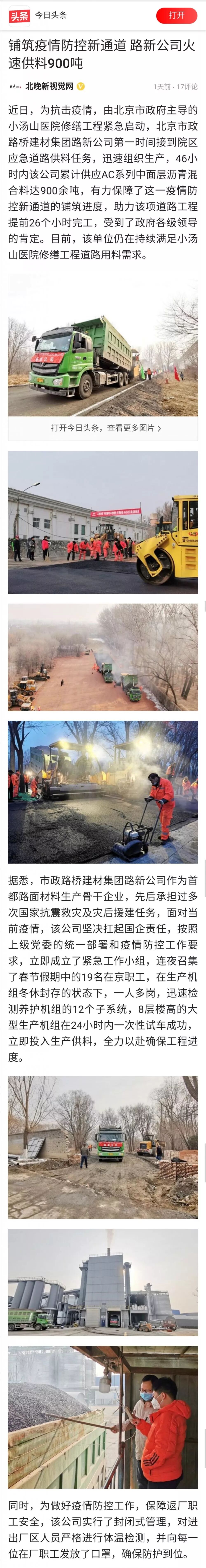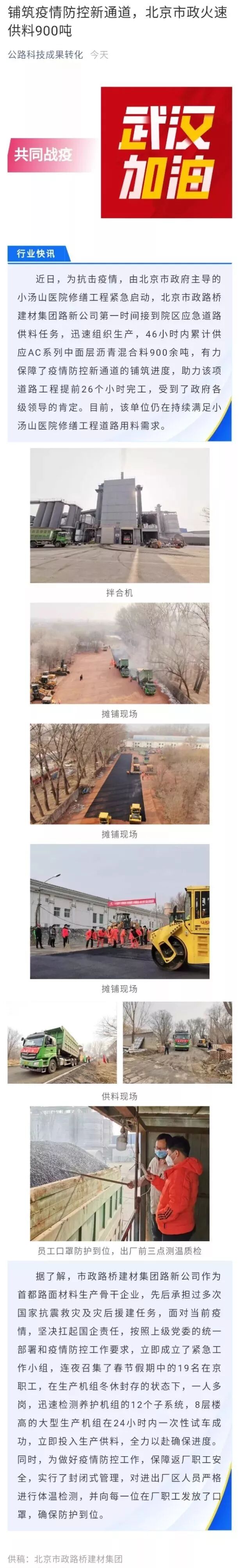 非常时期,路新公司为小汤山医院修缮工程火速供料900吨,体现了建材人的担当和奉献。对此,北京日报、中国建材报、北京晚报、今日头条、公路科技成果转化、绿色道路等媒体纷纷刊发报道。